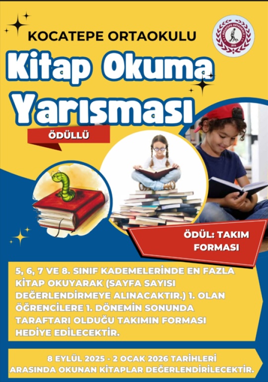 Öğrencilerimize kitap okuma alışkanlığı kazandırmak adına düzenlediğimiz ödüllü yarışmamızda, 8 Eylül 2025 - 2 Ocak 2026 tarihlerinde sayfa sayısı bazında en fazla kitap okuyan 5,6,7 ve 8. sınıf birincilerine taraftarı oldukları takımın forması hediye edilecektir.